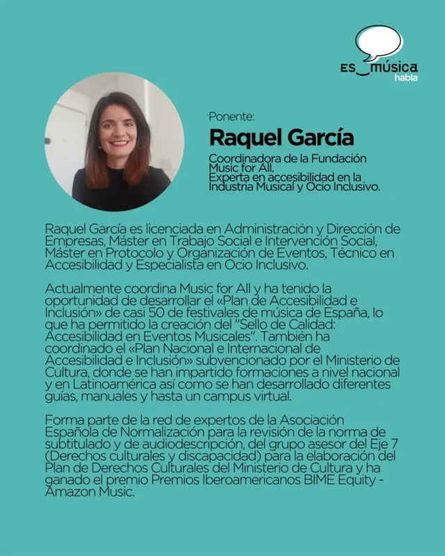 En este nuevo encuentro, contaremos con la participación de Raquel García (@raquel.garcia.cruz) de la @fundacionmusicforall, que expondrá los desafíos más comunes en materia de accesibilidad e inclusividad en los eventos musicales